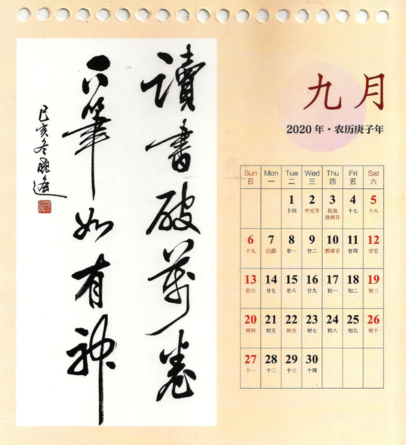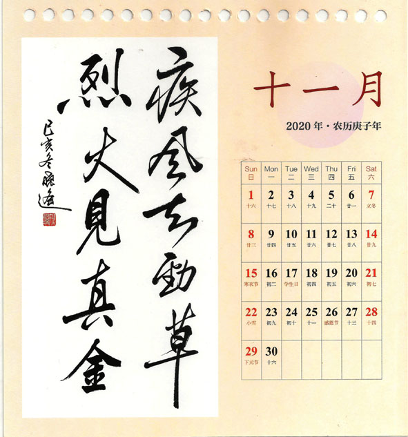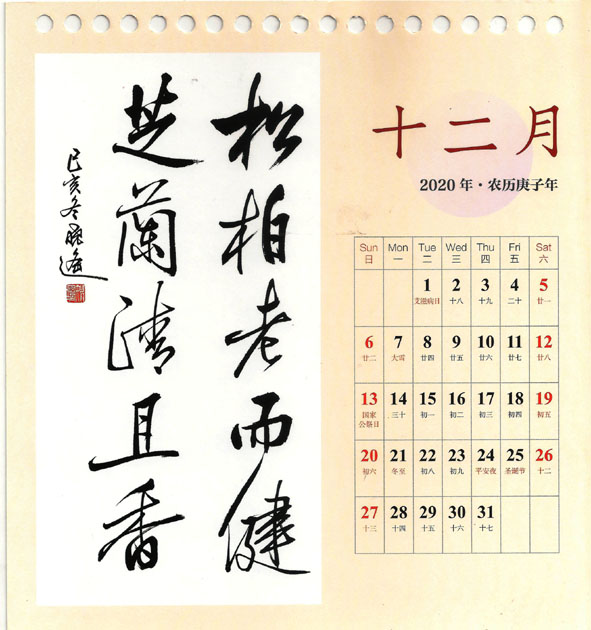 年末歲初,筆者收到了姚國培新出的2020年賀歲掛歷。這是一本設計新穎、制作精美、內容高雅、作品風格獨樹一幟的書法掛歷,用銅版紙印刷,每一幅作品都由姚國培自己創作、設計。