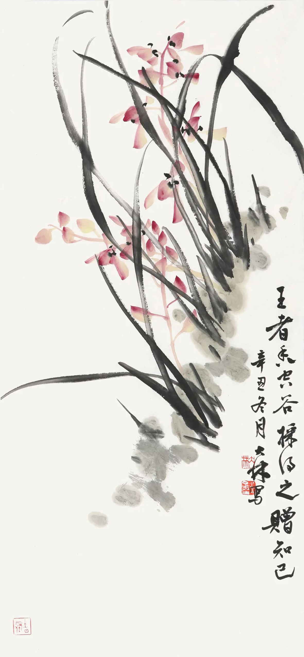 而率真,很好地表達了蘭的意味。觀大林的作品,不僅享受了他的寫蘭藝術,吮吸了滿紙?zhí)m氣,也欣賞到了他的書法藝術。