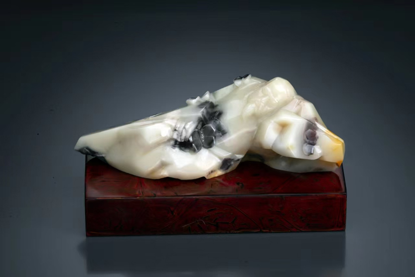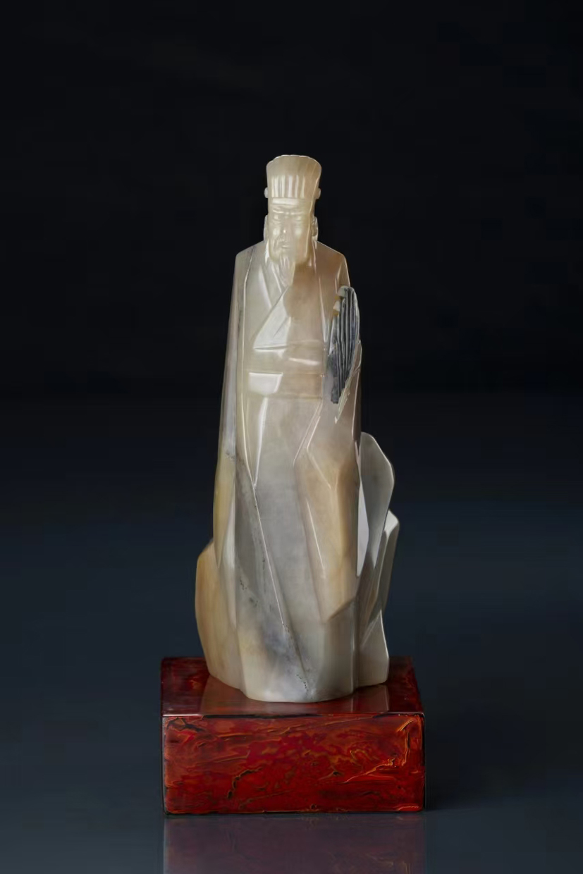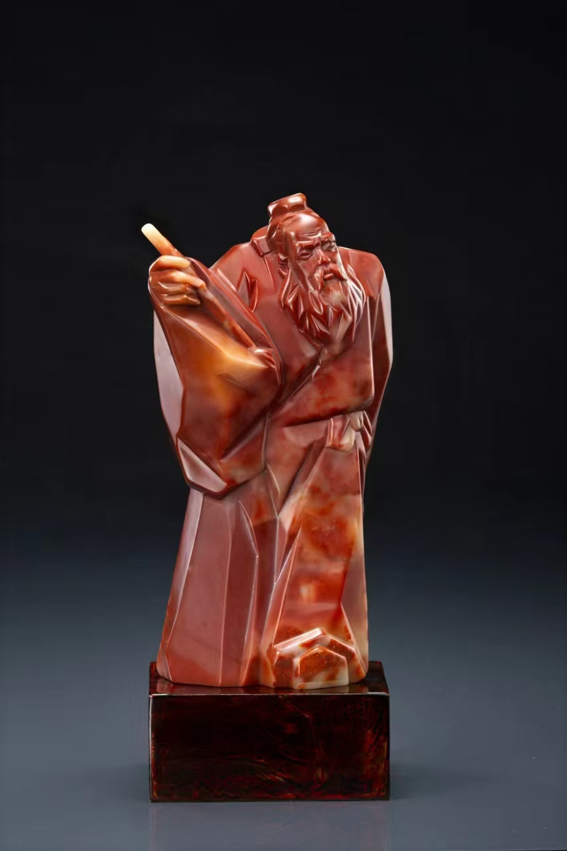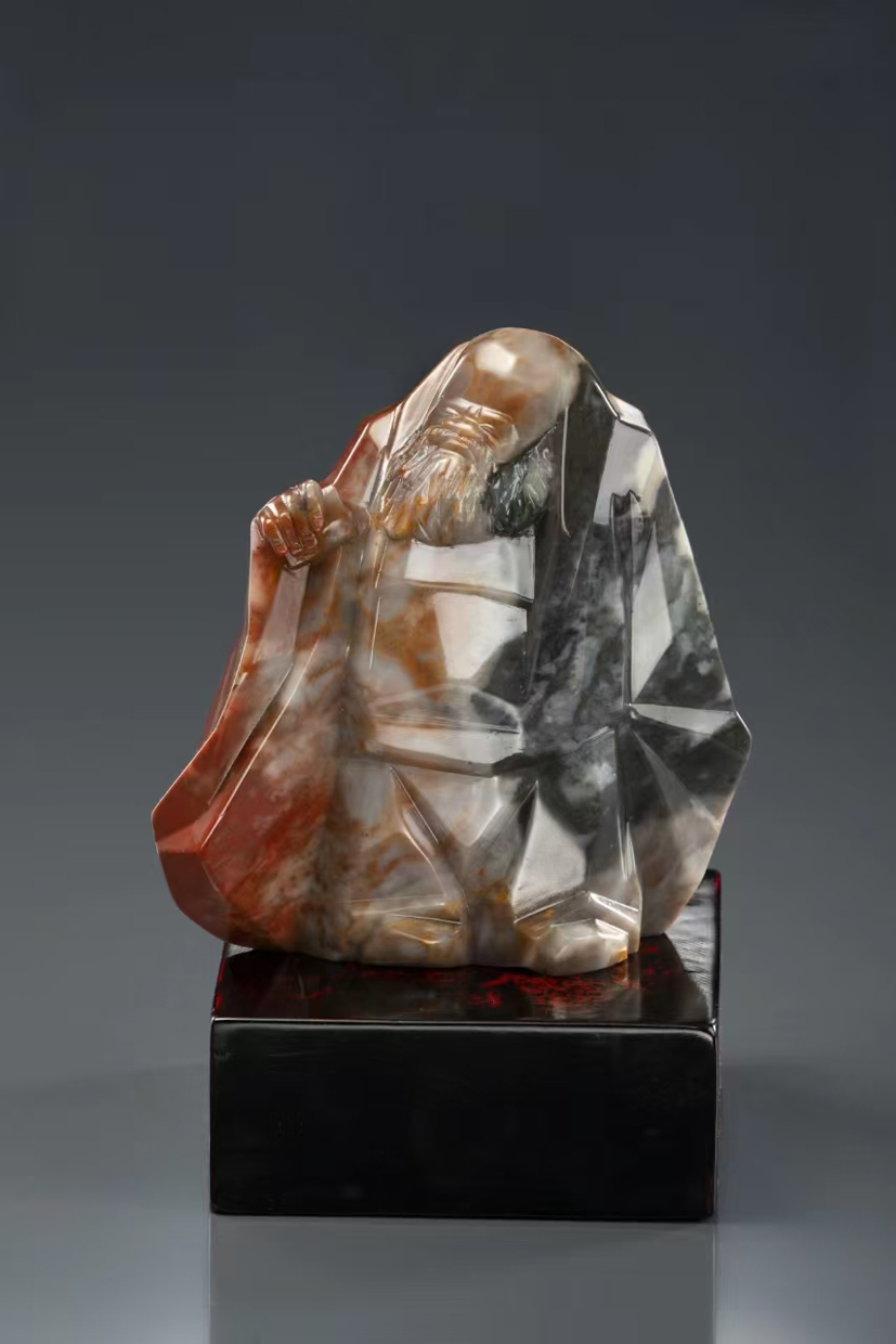 在福建壽山石雕刻界,黃寶慶是一位里程碑式的人物。他從事壽山石雕刻藝術(shù)工作四十多年,屢獲大獎。在創(chuàng)作中他主張象外求象、大象無形,把雕塑幾何切面應(yīng)用到壽山石人物雕刻中,創(chuàng)作了大量精品佳作。這種創(chuàng)作理念和創(chuàng)新手法,是黃寶慶對傳統(tǒng)壽山石雕刻藝術(shù)的當(dāng)代轉(zhuǎn)型,是對傳統(tǒng)壽山石雕刻方式的一種嘗試、探索和突破。宋偉光教授稱贊他的作品“具有當(dāng)代構(gòu)造感的雕塑語言。” 如2023年在中國美術(shù)館展出并被該館收藏的《深中隱厚》(6.3cm×6.3cm×13.5cm),其方寸之間所展現(xiàn)出的磅礴氣象讓我震撼,深感黃寶慶是一位“知行合一”的踐行者。他將一方普通的印石中的色彩、線條等元素,以幾何切面的方式較好地呈現(xiàn)出《史記》中記載的壺遂這位廉政忠厚的歷史人物的神采和靈魂。作品展出后得到專家和社會各界的一致好評。