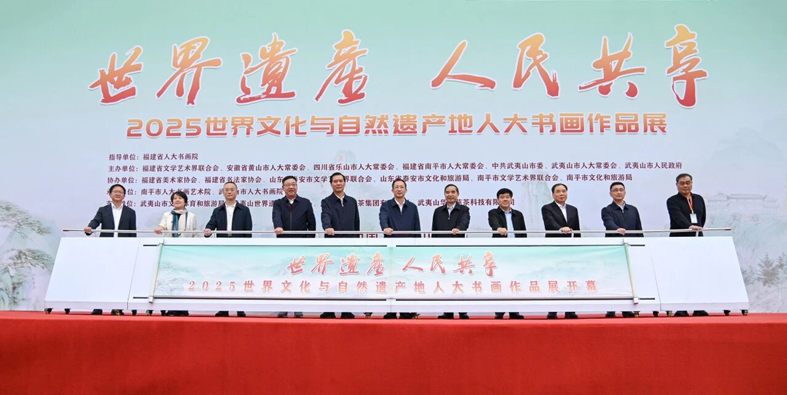 10月28日,由福建省人大書畫院指導,福建省文聯、中國四個“雙世遺”地所在設區市的人大常委會和有關部門,以及武夷山市共同舉辦的“世界遺產 人民共享”武夷山下風展紅旗如畫——2025世界文化與自然遺產地人大書畫作品展在武夷山正式開展。
