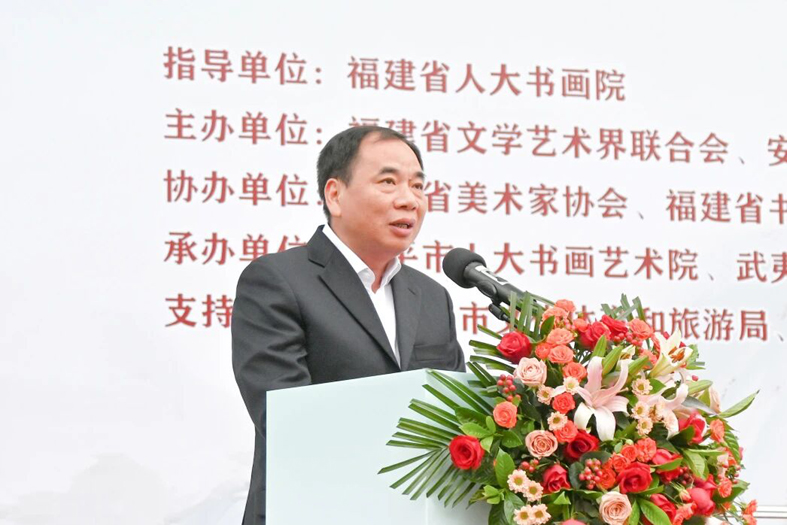 溫佳祿代表省人大書畫院致辭。他說,書畫工作具有強大的思想引領力、精神凝聚力、價值感召力和社會影響力。希望大家認真學習貫徹習近平文化思想,按照黨的二十屆四中全會對文化工作提出的要求,認真總結好經驗好做法,結合自身實際,精心謀劃人大書畫工作,積極舉辦富含福建文化特色與元素的展覽,不斷提升書畫工作的質量和水平,為展示福建文化新形象貢獻力量。