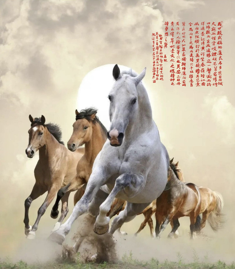 作者巧妙嵌入了干支哲學。“丙是陽火,午主位移”:這八個字是全篇的“文眼”。在五行中,丙火為太陽之光,象征熱烈、光明與能量;午在地支中代表正南方,也含有“震動”“變化”之意。將天干地支的特質與馬的形象結合,既點明了寫作的時間節點(丙午年),又賦予了馬一種烈火燎原、與時偕行的動感,暗示這是一個充滿變革與奮進力量的年份。