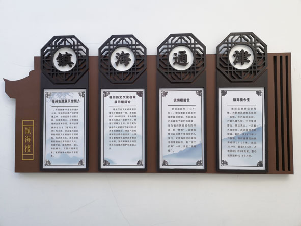 鎮海樓在原樣復制遺址舊貌的基礎上加建了地宮。“地宮”二層設計了一個珍寶館,館室地面鋪有青石板,墻上設有許多格子,每個格子里都陳列了福建特色的藝術品。“地宮”一層建成福州名城展示館,將福州城市演變歷史和建筑史濃縮其中。