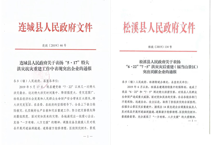 2019年6、7月,松溪縣遭遇持續(xù)集中的強(qiáng)降雨,造成了“6.22”和“7. 5”兩次特大洪澇災(zāi)害,給人民群眾生命財(cái)產(chǎn)造成重大威脅。蔡明聞?dòng)嵑螅⒓绰?lián)合14家兄弟企業(yè),集資近60萬援助松溪縣抗災(zāi)情。在福當(dāng)山景區(qū)災(zāi)后重建中,14 家先進(jìn)企業(yè)調(diào)集設(shè)備及人員開展河道涵洞疏通、道路溜方搶修清理、匡扶倒伏樹木、景觀修復(fù)等,充分展現(xiàn)了“一方有難,八方支援”的大愛精神,得到了松溪縣人民政府的通報(bào)表揚(yáng)。在2019年“5. 17”連城特大洪澇災(zāi)害中,參與兄弟企業(yè)一共集資近100萬捐款為連城縣抗災(zāi)情提供援助,得到了連城縣人民政府的通報(bào)表揚(yáng)。