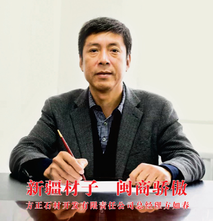 他,白手起家,踏平坎坷;他,嚴謹務實,一絲不茍;他,敢于“異想天開”,敢于推陳出新,敢于挑戰不可能;他,做事用心,做人用情,做事如水,做人如山。 他是一位性格堅強,具有強烈事業心、責任感和奉獻精神的閩商,在長期的企業經營中,團結帶領公司全體員工敢于創新創業創效;他以過人的膽識和魄力,開啟了企業新天地,以寬廣的胸懷和格局,包容、隱忍,把企業做大做強。他就是奇臺縣方正石材開發有限責任公司總經理方如春。作為民營企業的掌舵者,他堅持以一顆勤勞致富的紅心、一顆回報社會的愛心、一顆堅守實業的初心、一顆關懷他人的善心。